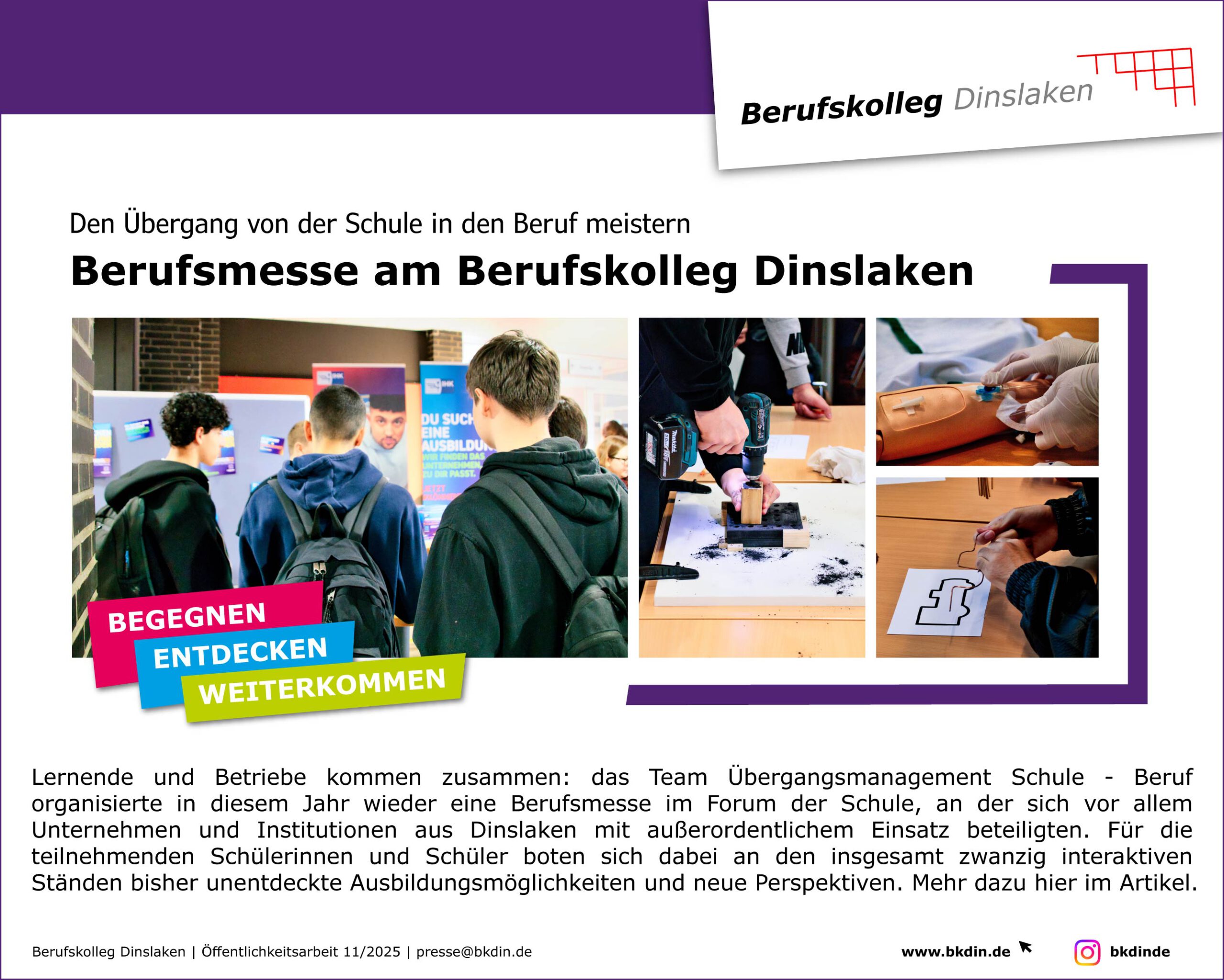 Den Übergang von der Schule in den Beruf meistern Berufsmesse am Berufskolleg Dinslaken: Lernende und Betriebe kommen zusammen Persönliche Kontakte, Austausch zwischen Arbeitgeberinnen und Arbeitgebern [ Zum vollständigen Artikel … ]