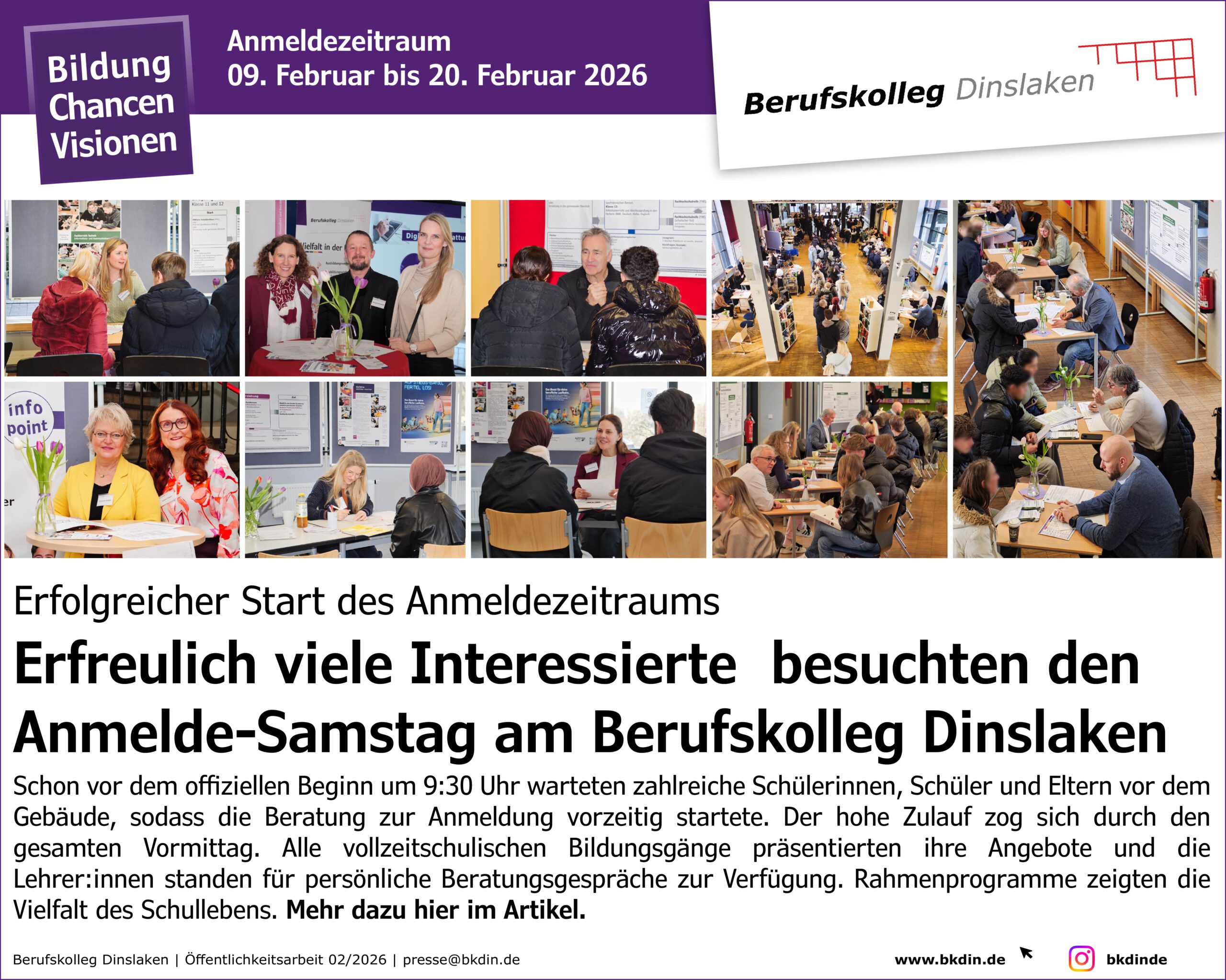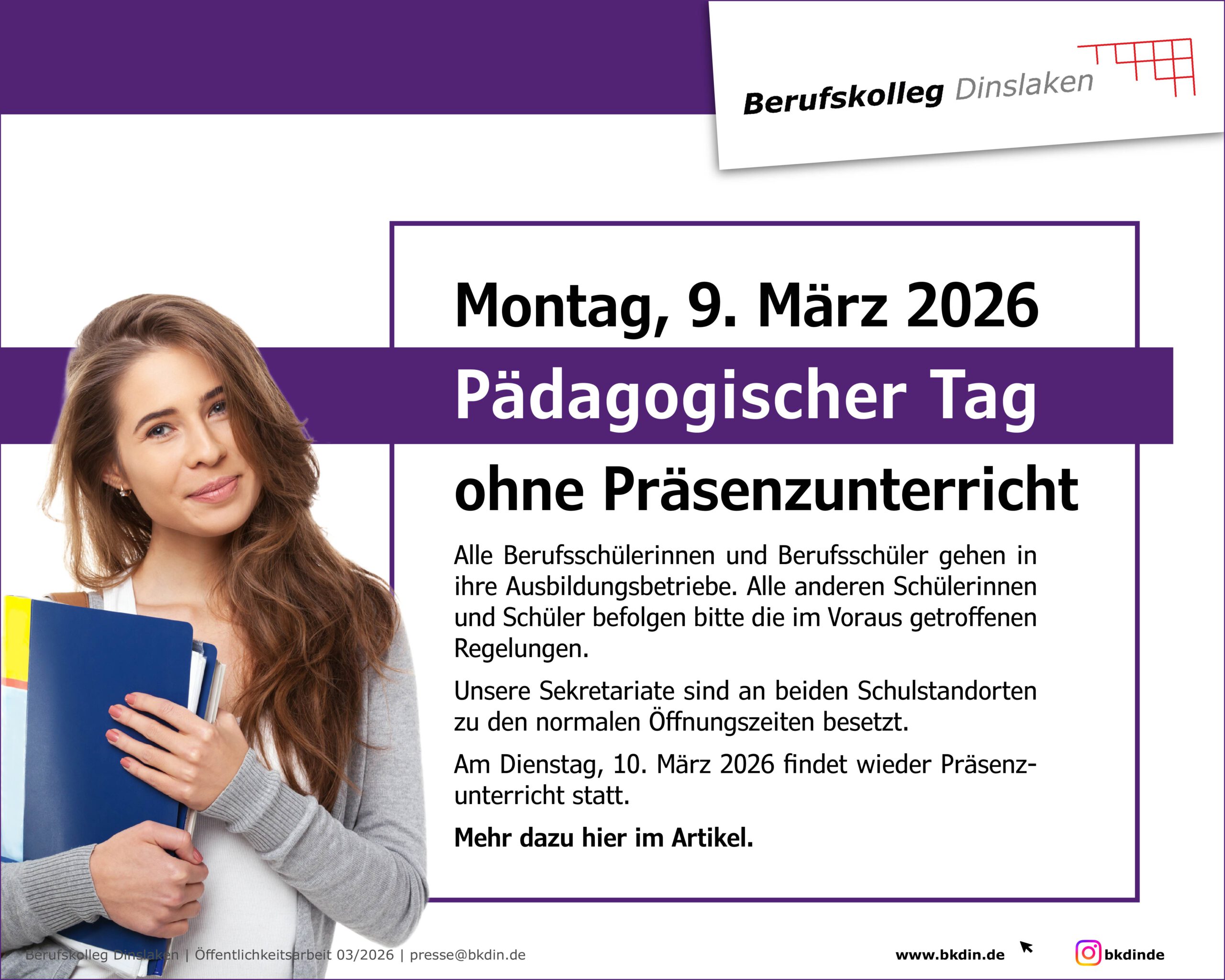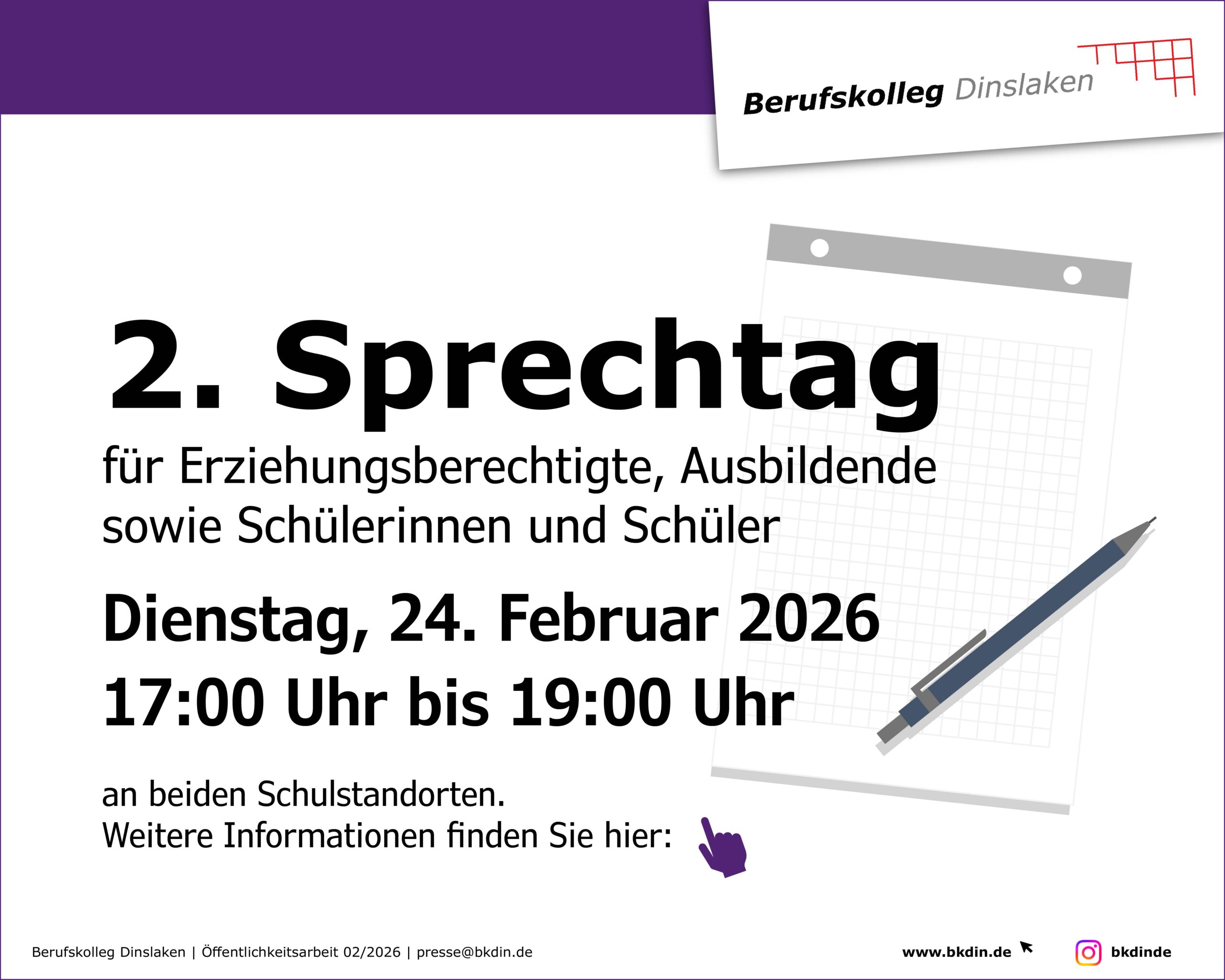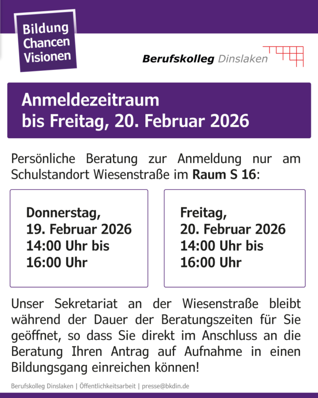 Start der Anmeldephase für das Schuljahr 2026/27: Info- und Anmelde-Samstag am 7. Februar 2026 Am Samstag, 7. Februar 2026, lädt das Berufskolleg Dinslaken am Schulstandort [ Zum vollständigen Artikel … ]