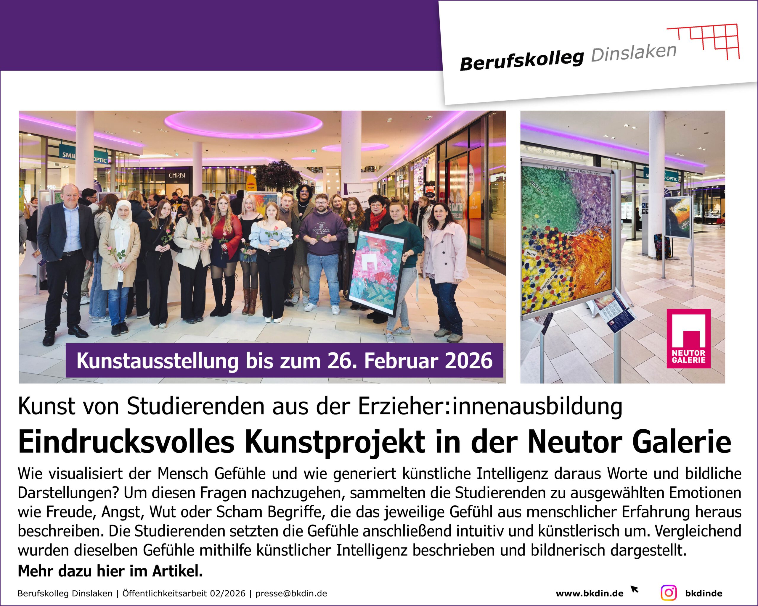 Kunst von Studierenden aus der Erzieher:innenausbildung Eindrucksvolle Kunstausstellung in der Neutor Galerie „Gefühle sichtbar machen – Menschliche Malerei im Vergleich mit künstlicher Intelligenz”, so das [ Zum vollständigen Artikel … ]