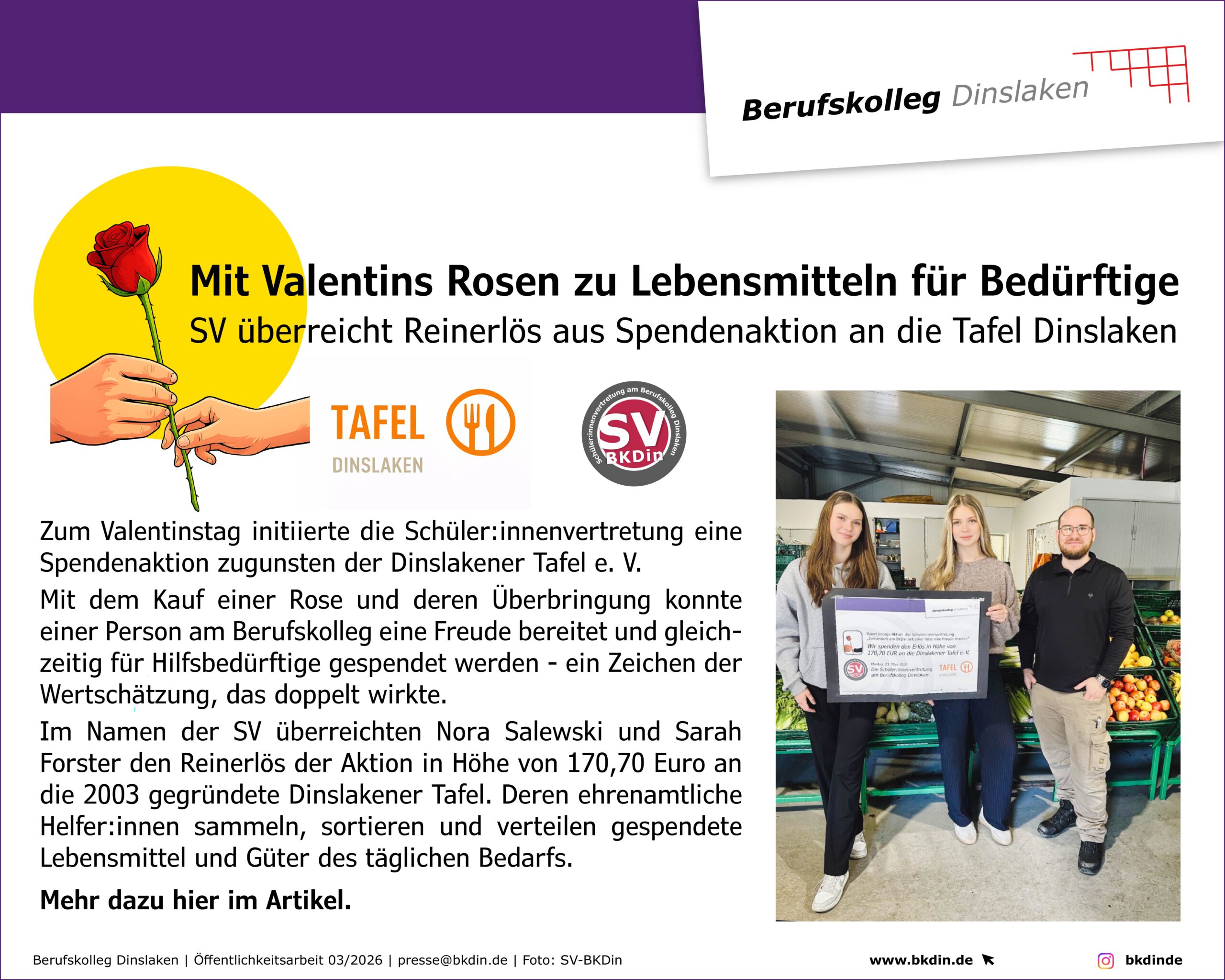 Mit Valentins Rosen zu Lebensmitteln für Bedürftige: SV überreicht Reinerlös aus Spendenaktion an die Tafel Dinslaken Zum Valentinstag initiierte die Schüler:innenvertretung eine Spendenaktion zugunsten der [ Zum vollständigen Artikel … ]