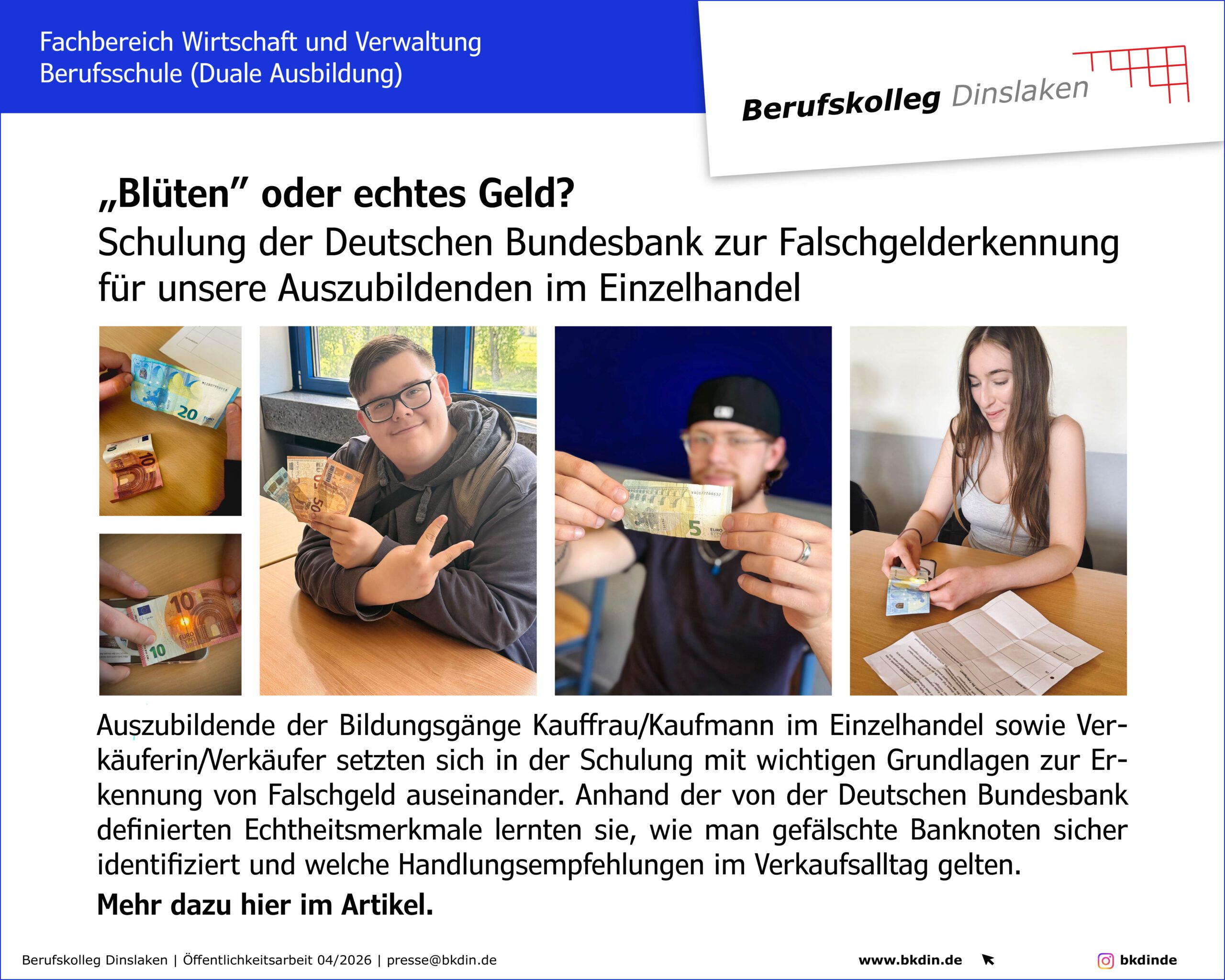 „Blüten” oder echtes Geld? Schulung zur Falschgelderkennung durch die Deutsche Bundesbank für unsere Auszubildenden im Einzelhandel Auszubildende aus den Unterstufen der Bildungsgänge Kauffrau/Kaufmann im Einzelhandel [ Zum vollständigen Artikel … ]
