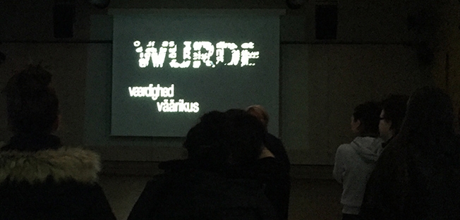 „Die Würde des Menschen ist unantastbar“. Dieser Satz stammt aus dem Artikel 1 des Grundgesetzes und sagt aus, dass alle Menschen mit Würde behandelt werden sollen. Dies sollte Ausgangspunkt für eine visuelle Umsetzung dieser Thematik dienen. Das Ergebnis: Eine animierte Lichtinstallation, die am 28.02.2018 im Forum präsentiert wurde. Vorausgegangen war viel Arbeit und ein dreitägiger Workshop mit dem renommierten Kölner Künstler Detlef Hartung, der für seine außergewöhnlichen Lichtinstallationen bekannt ist.