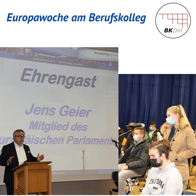 Das Leben des Europagedankens als wichtigen Beitrag zur Sicherung des Friedens, der seit nunmehr 76 Jahren besteht: Schulleiter Florian Eckert begrüßte zum Auftakt der Veranstaltung anlässlich des Abschlusses der Europawoche am Berufskolleg Dinslaken neben den beteiligten Schüler/-innen und Lehrer/-innen auch den SPD-Europaabgeordneten Jens Geier. In seinem eindringlichen historischen Rückblick erinnerte der Schulleiter daran, wie wichtig es sei, die positiven europäischen Errungenschaften nicht als Selbstverständlichkeit zu verstehen, sondern den hart errungenen Frieden durch Gemeinschaft und intensive Zusammenarbeit über Krisen hinweg zu sichern.