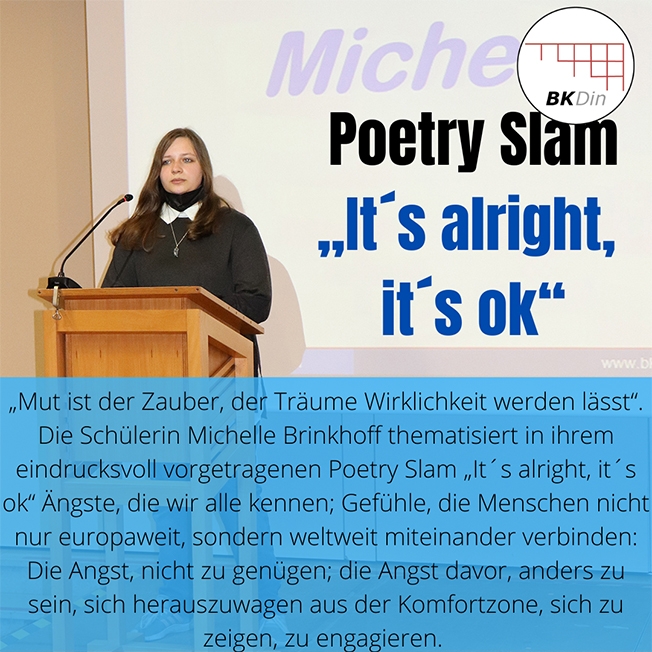 „Mut ist der Zauber, der Träume Wirklichkeit werden lässt“. Die Schülerin Michelle Brinkhoff thematisiert in ihrem eindrucksvoll vorgetragenen Poetry Slam „It´s alright, it´s ok“ Ängste, die wir alle kennen, Gefühle, die Menschen nicht nur europaweit, sondern weltweit miteinander verbinden: Die Angst nicht zu genügen, die Angst davor, anders zu sein, sich herauszuwagen aus der Komfortzone, sich zu zeigen, zu engagieren. Mut brauchten wir, aber auch Unterstützung von Anderen. Gemeinsamkeit, Kommunikation, Streit, der „ok“ sei und hinausführe aus der Sackgasse. Was Michelle hier eindringlich vermittelte, kann auch als eine Vision für Europa verstanden werden.