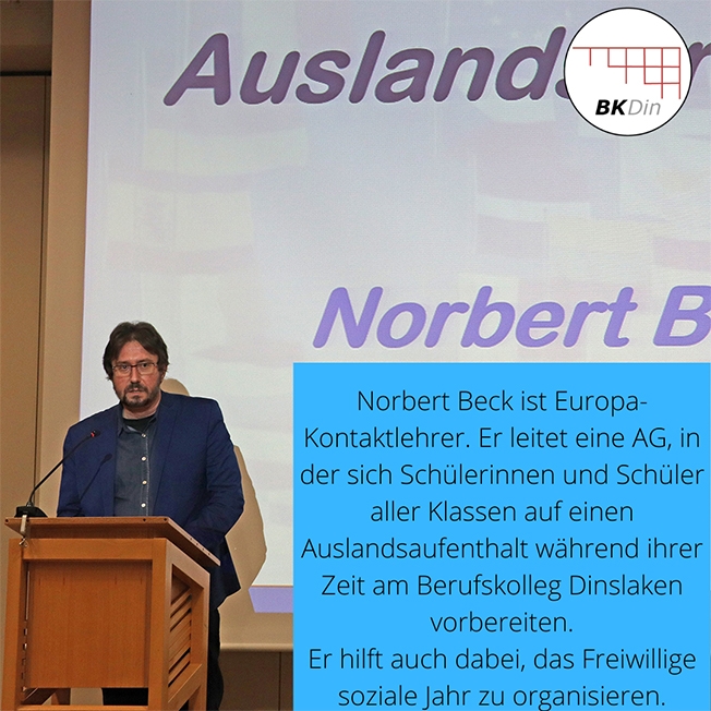 Norbert Beck berichtete von den vielfältigen Möglichkeiten für Schüler/-innen aller Bildungsgänge des BK Dinslaken, im Rahmen des Programms „Erasmus +“ den Alltag und das Arbeitsleben in anderen europäischen Ländern für einen längeren Zeitraum kennenzulernen. Austauschtreffen und Praktika in Spanien, den Niederlanden, Griechenland, Irland, in Frankreich und der Türkei standen bereits auf dem Programm. Im laufenden Schuljahr geht es nach einer längeren pandemiebedingten Zwangspause hoffentlich endlich weiter.