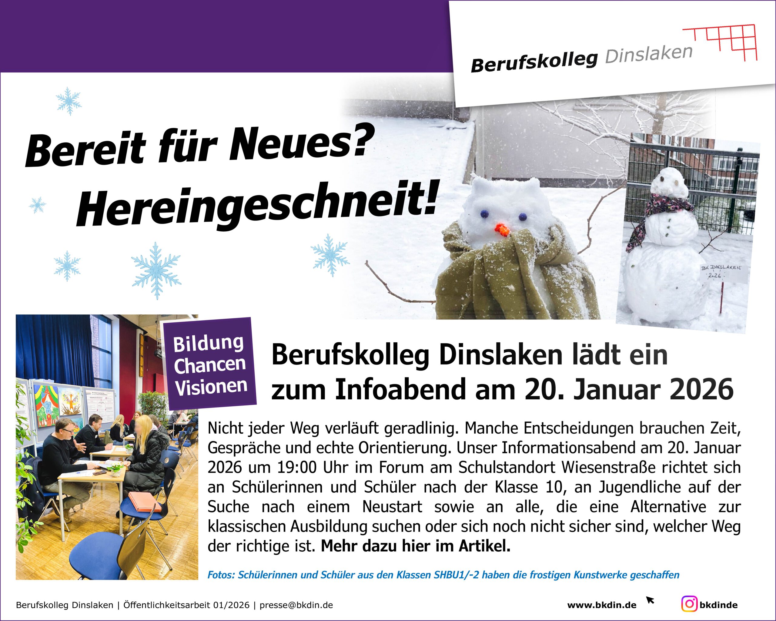 Nicht jeder Weg verläuft geradlinig. Manche Entscheidungen brauchen Zeit, Gespräche und echte Orientierung. Unser Informationsabend am 20. Januar 2026, 19:00 Uhr im Forum am Schulstandort Wiesenstraße richtet sich an Schülerinnen und Schüler nach der Klasse 10, an Jugendliche auf der Suche nach einem Neustart sowie an alle, die eine Alternative zur klassischen Ausbildung suchen oder sich noch nicht sicher sind, welcher Weg der richtige ist.