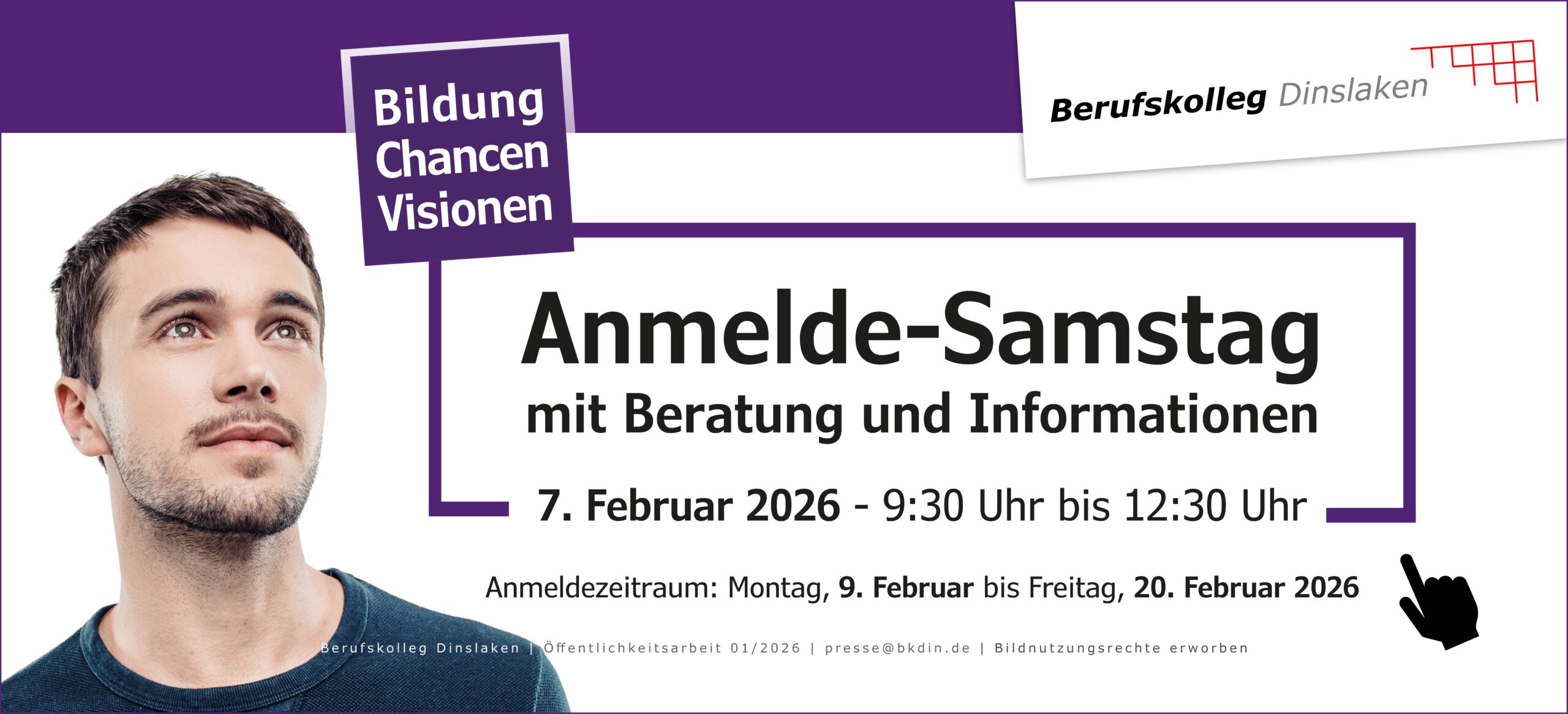 Am 7. Februar 2026 startet mit dem großen Anmeldesamstag der 14‑tägige Anmeldezeitraum für das Schuljahr 2026/2027 am Berufskolleg Dinslaken. Es ist sinnvoll, sich bereits im Voraus Gedanken über die Zukunft zu machen und sich frühzeitig über die eigenen Möglichkeiten und Chancen an einem Berufskolleg zu informieren. Gelegenheit dazu bietet der Infoabend am Dienstag, 20. Januar 2026, mit persönlicher Beratung durch unser Team. Darüber hinaus steht während des gesamten Schuljahres die wöchentliche Laufbahnberatung für Schüler:innen und Eltern offen. Termine und Hinweise finden Sie hier: bkdin.de/beratung
