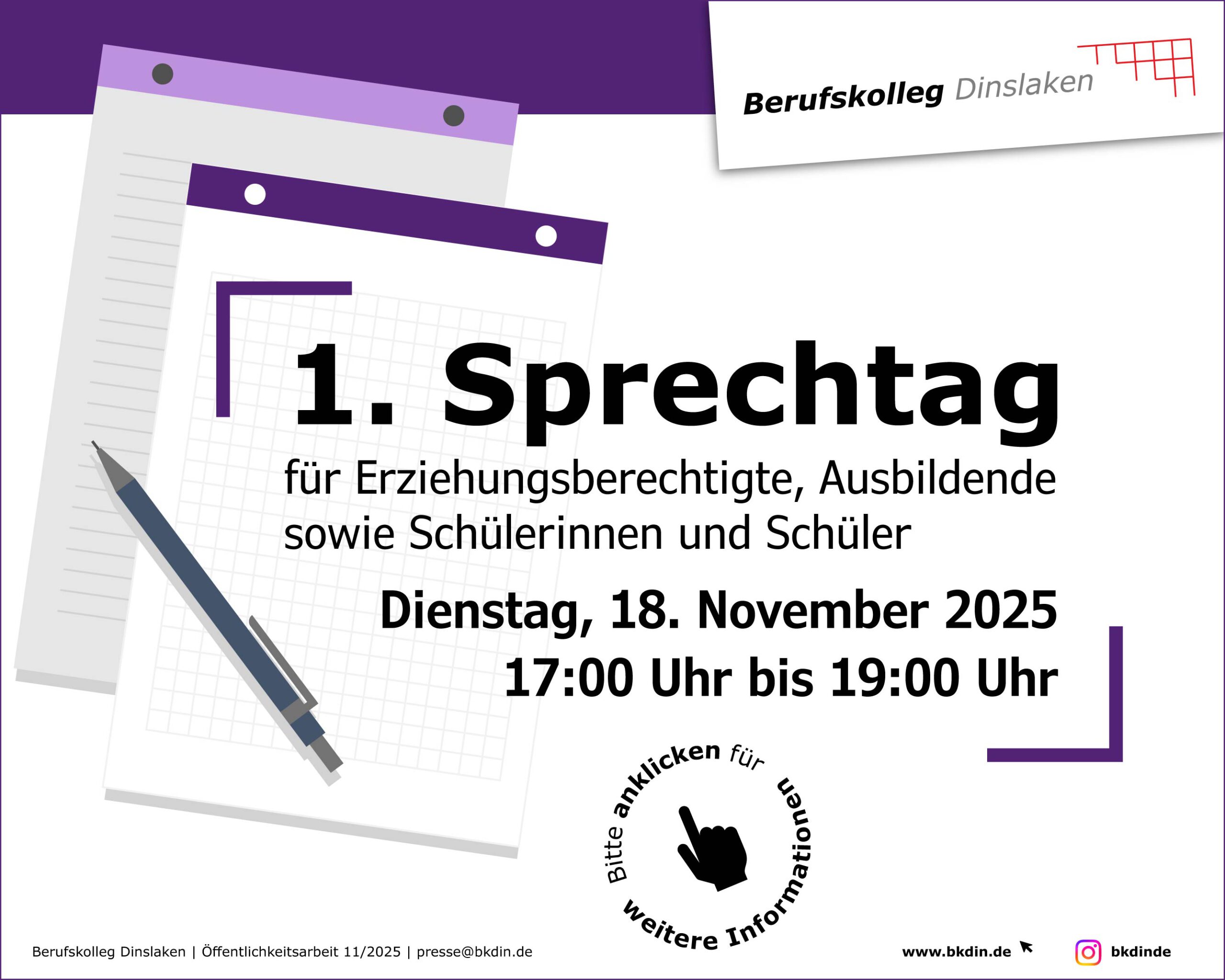 Einladung zum 1. Sprechtag am 18. November 2025 für Erziehungsberechtigte, Ausbilder:innen und Schüler:innen Wir laden Sie herzlich ein, den 1. Sprechtag zu nutzen, um sich [ Zum vollständigen Artikel … ]