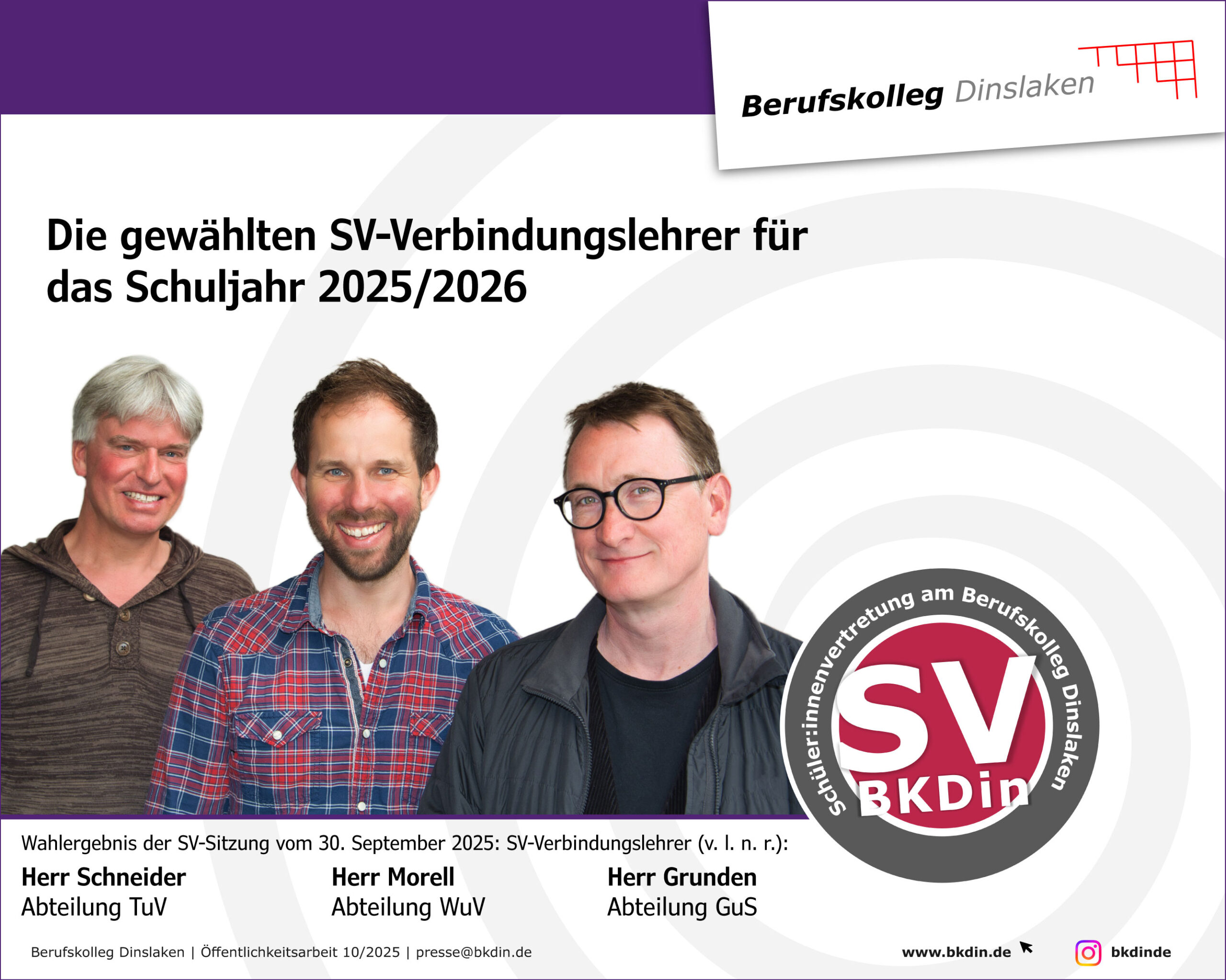 In jedem Schuljahr wählen die Mitglieder des Schülerinnen- und Schülerrates (das ist die Versammlung aller Klassensprecherinnen und Klassensprecher) bis zu drei Lehrpersonen als SV-Verbindungslehrerinnen und -Verbindungslehrer. In den vergangenen Jahren stellten sich Herr Schneider, Herr Morell und Herr Grunden zur Wahl. Für das Schuljahr 2025/2026 wurden diese SV-Verbindungslehrer wiedergewählt.