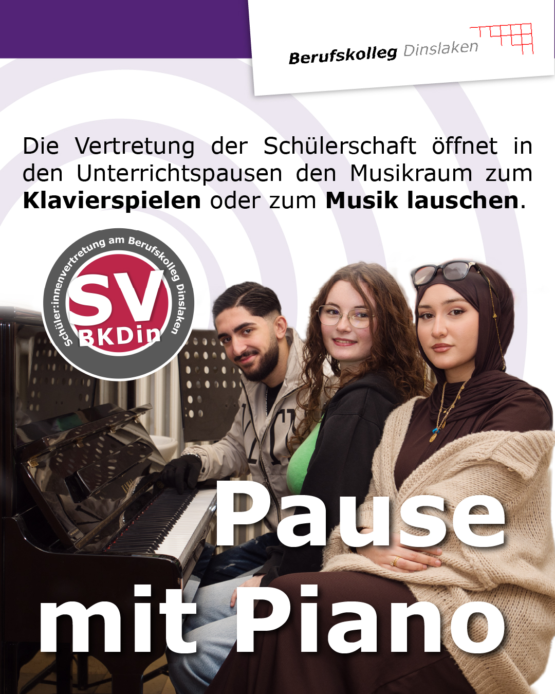 Dienstags und freitags in der 1. und 2. Unterrichtspause öffnet der Musikraum zum Klavierspielen, zum Musik lauschen und zum Gespräch! Freitags steht unser SV-Kernteam auch zur Sprechstunde in dem Raum bereit.
