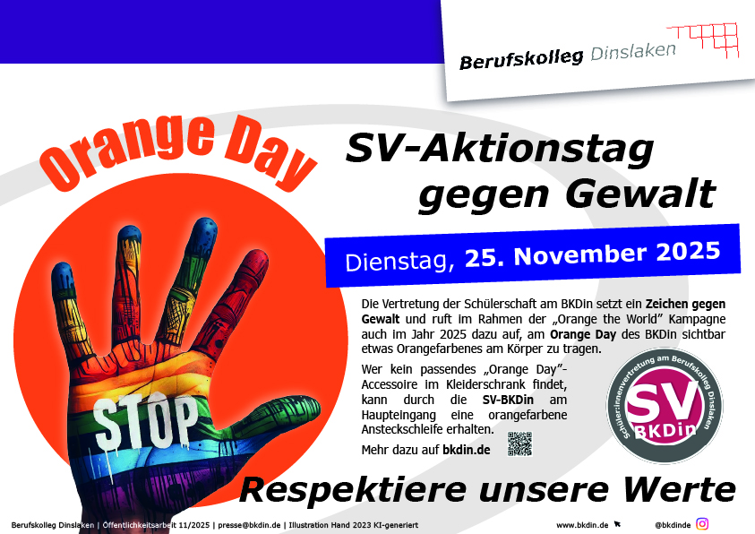 Diese Aktion ist angelehnt an die Kampagne „Orange the World“ und dem „internationalen Tag zur Beseitigung von Gewalt gegen Frauen“ am 25. November 2025. Zu diesem Tag plant die Stadt Dinslaken eine Aktion mit einem Infostand in der Neutor Galerie von 12:00 Uhr bis 15:00 Uhr und einem anschließenden Marsch zum Rathaus. Die SV lädt Schülerinnen und Schüler in ihren unterrichtsfreien Zeiten zur Teilnahme ein.