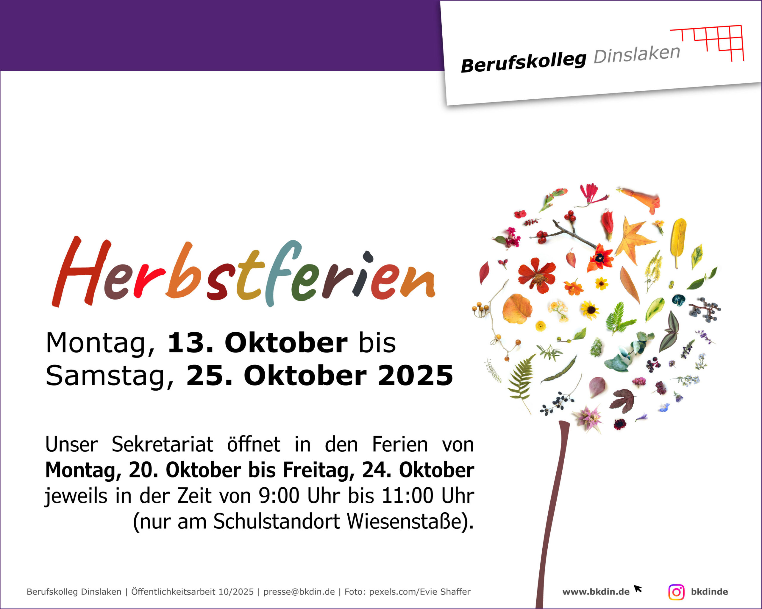 Unsere Öffnungszeiten in den Herbstferien: Montag, 13. Oktober bis Samstag, 25. Oktober 2025 Das Sekretariat am Schulstandort Wiesenstraße:  (Am Schulstandort Konrad-Adenauer-Straße bleibt das Sekretariat geschlossen) [ Zum vollständigen Artikel … ]